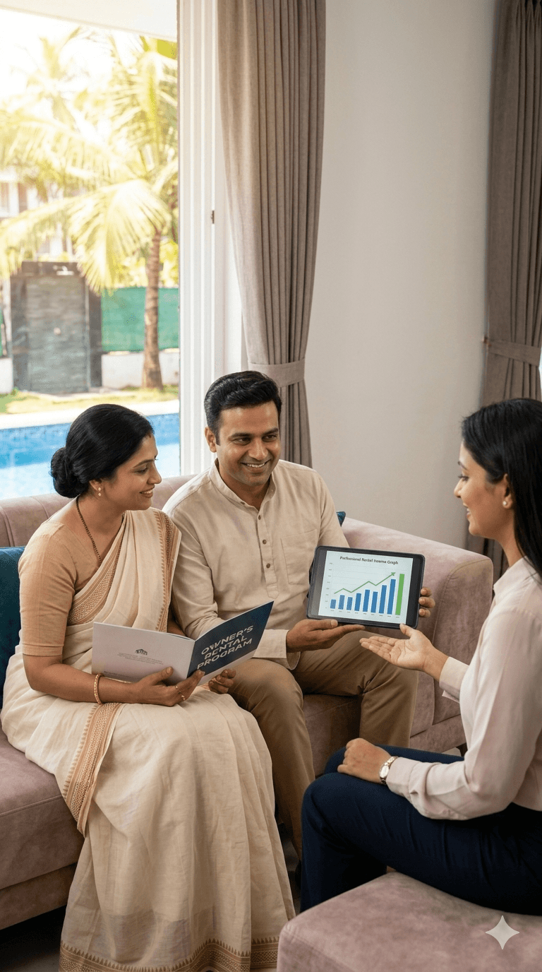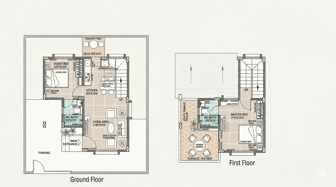 A thoughtfully designed 1BHK holiday home with airy living spaces, cozy bedrooms, a functional kitchen, and convenient parking—perfect for relaxed getaways and peaceful stays.